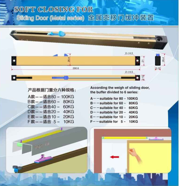 GY506 Soft Close Damper for sliding doors integrates advanced hydraulic technology to ensure smooth, noise-free closure, eliminating slamming across diverse door weights. Tailored for closet systems, cabinets, and sliding door buffer applications, it offers 5 models: